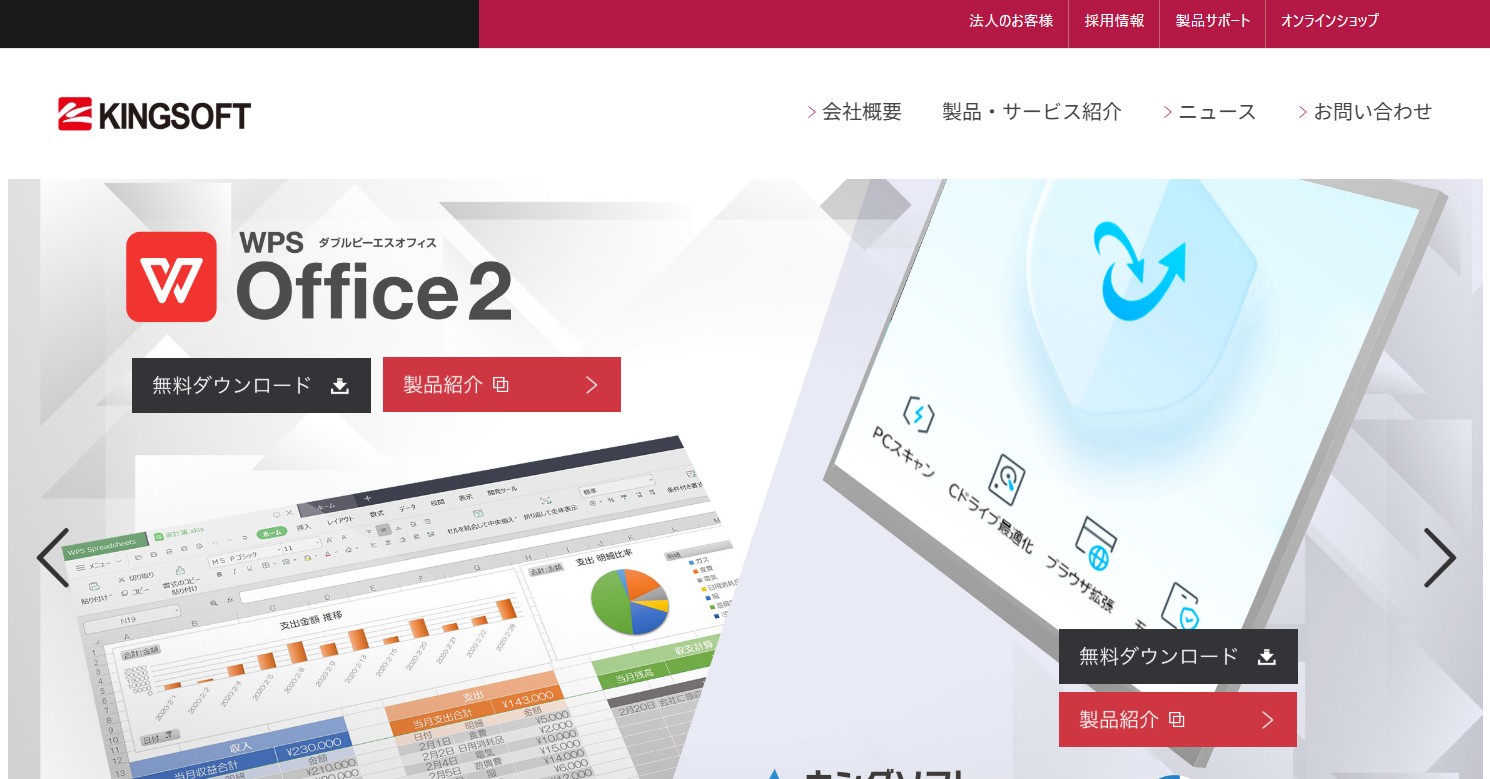 キングソフトは、ウイルス対策などのセキュリティソフトと、文書作成・表計算・資料作成ができるオフィスソフトを中心に提供しています。